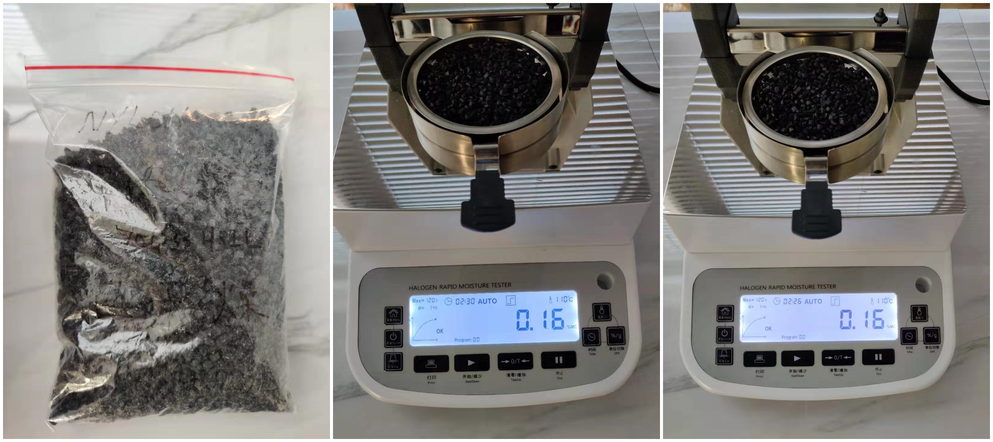 - 復(fù)位儀器,待儀器冷卻至40℃以下后,再取15g左右已烘干尼龍顆粒均勻鋪在樣品盤上,重復(fù)上述測(cè)試步驟;測(cè)試結(jié)束后得出第二組數(shù)據(jù),顯示樣品的水分含量為0.16%;結(jié)果可靠,可重復(fù)性好。
