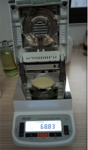 二、儀器本身有個自動降溫過程,為求得數(shù)據(jù)的準(zhǔn)確性,故在進(jìn)行第二次測量的時候先等待幾分鐘,使儀器顯示溫度為40度以下時再進(jìn)行第二次測量,這次我們加大膠水樣品量為7.025克,將膠水均勻滴于鋁箔盤上,溫度照樣設(shè)定在120℃,按“START”鍵開始進(jìn)行測試,由于這次的膠水量比較多,所以儀器此次用了17分鐘43秒才測試結(jié)束,測試結(jié)果數(shù)據(jù)顯示31.17%(含水率),按“單位鍵”切換其顯示數(shù)據(jù),則屏幕顯示其固含量為68.83%。