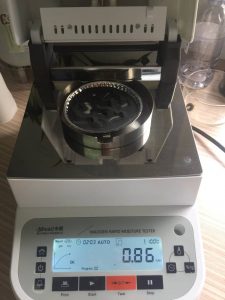 3、平衡后將樣品瓶移出,取出樣品,用電子天平稱(chēng)取樣品置于樣品瓶?jī)?nèi),然后在水分儀上點(diǎn)擊開(kāi)始測(cè)量,同時(shí)將樣品瓶裝入加熱槽。